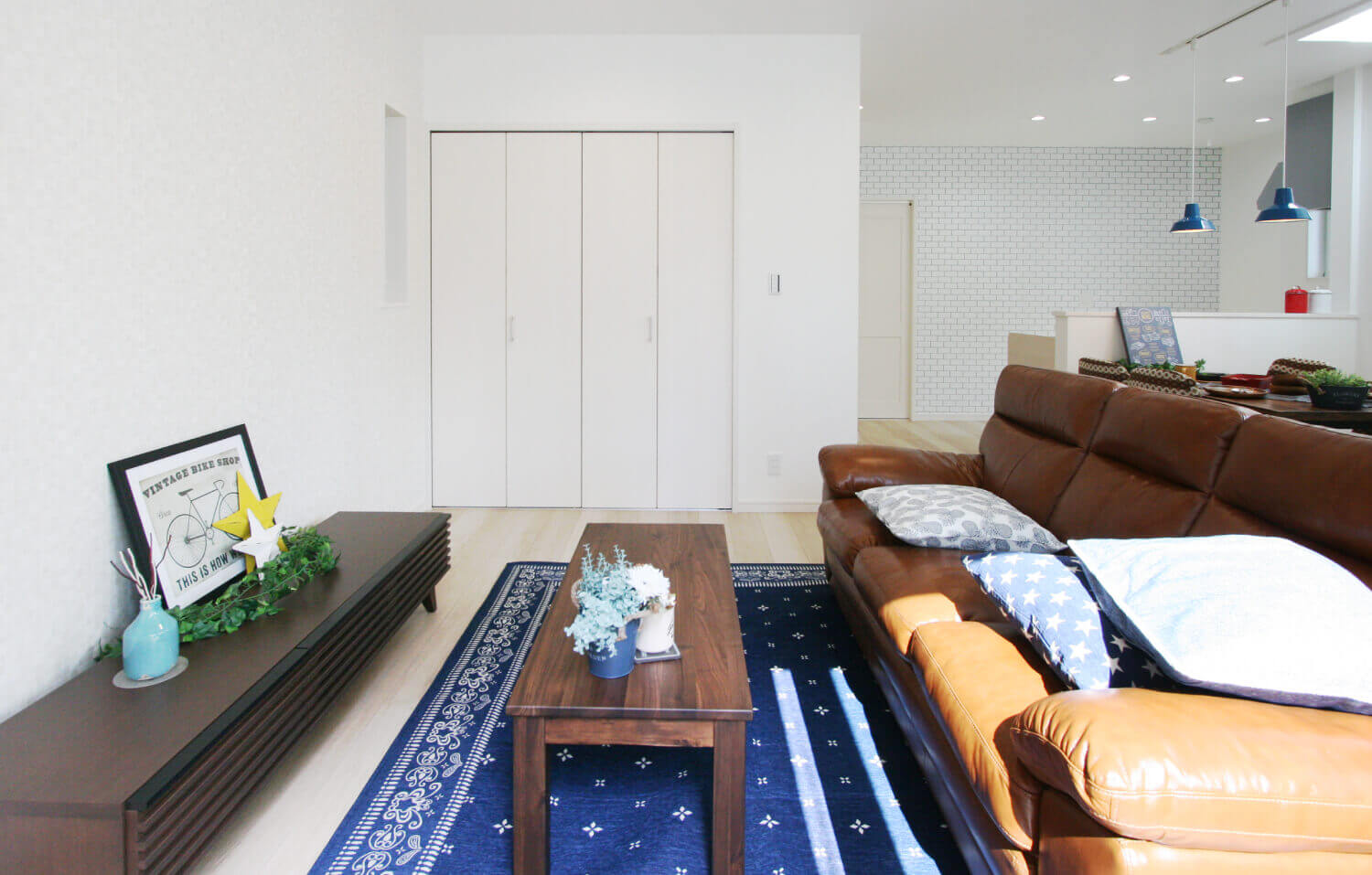 キッチンはレンガ調の白壁でシンプルに仕上げました。懐かしそうで新しいレンガ調の壁は居心地の良さを演出します。所々に青を入れることでコントラストが楽しめるオシャレな空間となっています。